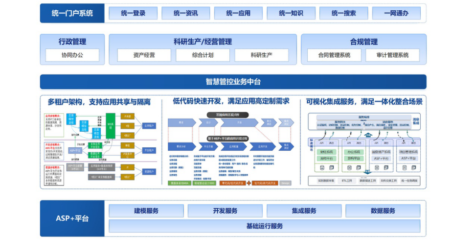 ASP+基礎(chǔ)運(yùn)行服務(wù):提供了云原生、微服務(wù)、組件化、服務(wù)化等基礎(chǔ)運(yùn)行環(huán)境和可復(fù)用的基礎(chǔ)技術(shù)組件、可共享的技術(shù)服務(wù),為用戶(hù)業(yè)務(wù)系統(tǒng)建設(shè),從平臺(tái)層面實(shí)現(xiàn)環(huán)境適配能力和全面安全保障能力。