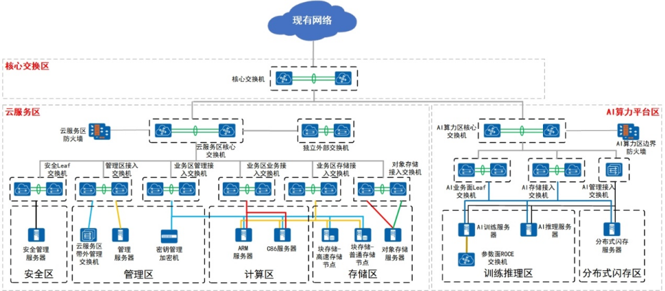 方案設(shè)計:根據(jù)需求分析結(jié)果,設(shè)計定制化的云數(shù)據(jù)中心基礎(chǔ)設(shè)施建設(shè)方案。涵蓋計算基礎(chǔ)設(shè)施、存儲基礎(chǔ)設(shè)施、網(wǎng)絡(luò)基礎(chǔ)設(shè)施、安全基礎(chǔ)設(shè)施、電力基礎(chǔ)設(shè)施、制冷基礎(chǔ)設(shè)施、機房設(shè)施、管理與監(jiān)控系統(tǒng)等各個子系統(tǒng)的架構(gòu)設(shè)計,確保各部分協(xié)同工作,滿足用戶長期發(fā)展需求。