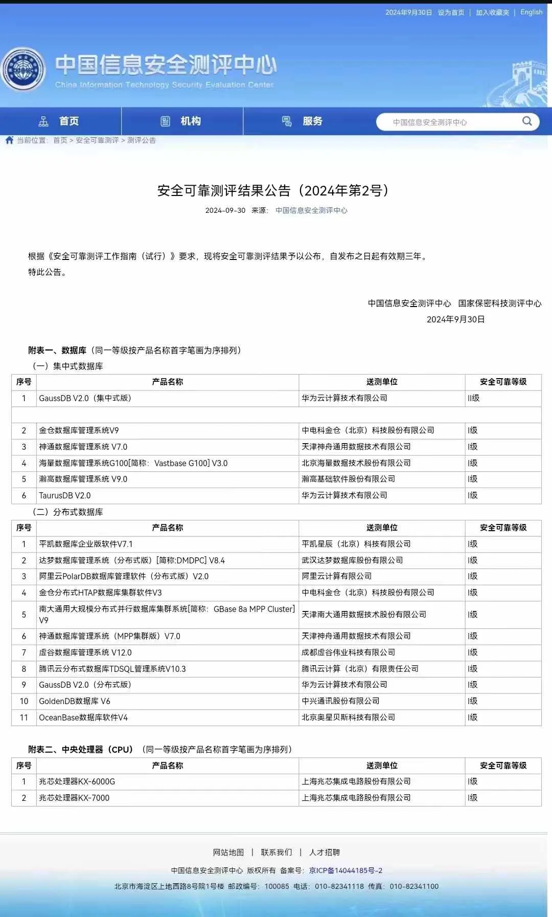 9月30日,中國信息安全測評中心、國家保密科技測評中心發(fā)布了《安全可靠測評結(jié)果公告(2024年第2號)》。神軟子公司神通公司的集中式數(shù)據(jù)庫產(chǎn)品神通數(shù)據(jù)庫管理系統(tǒng) V7.0、分布式數(shù)據(jù)庫產(chǎn)品神通數(shù)據(jù)庫管理系統(tǒng)(MPP集群版)V7.0通過測評,獲得安全可靠等級“I級”。