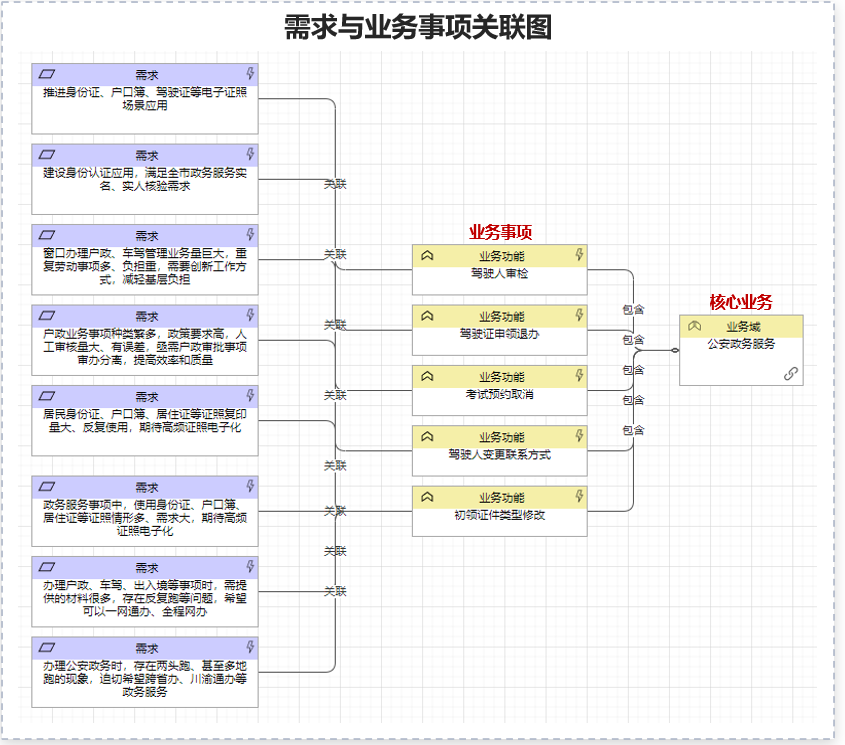 需求與業(yè)務事項關聯(lián):通過工具將重大需求關聯(lián)到核心業(yè)務及業(yè)務事項。定準核心業(yè)務是“V”模型應用的起點,從需求出發(fā),謀劃多跨場景的第一步就是要找到場景所在的核心業(yè)務和事項,自此開始對業(yè)務進行多跨場景的拆解和集成。