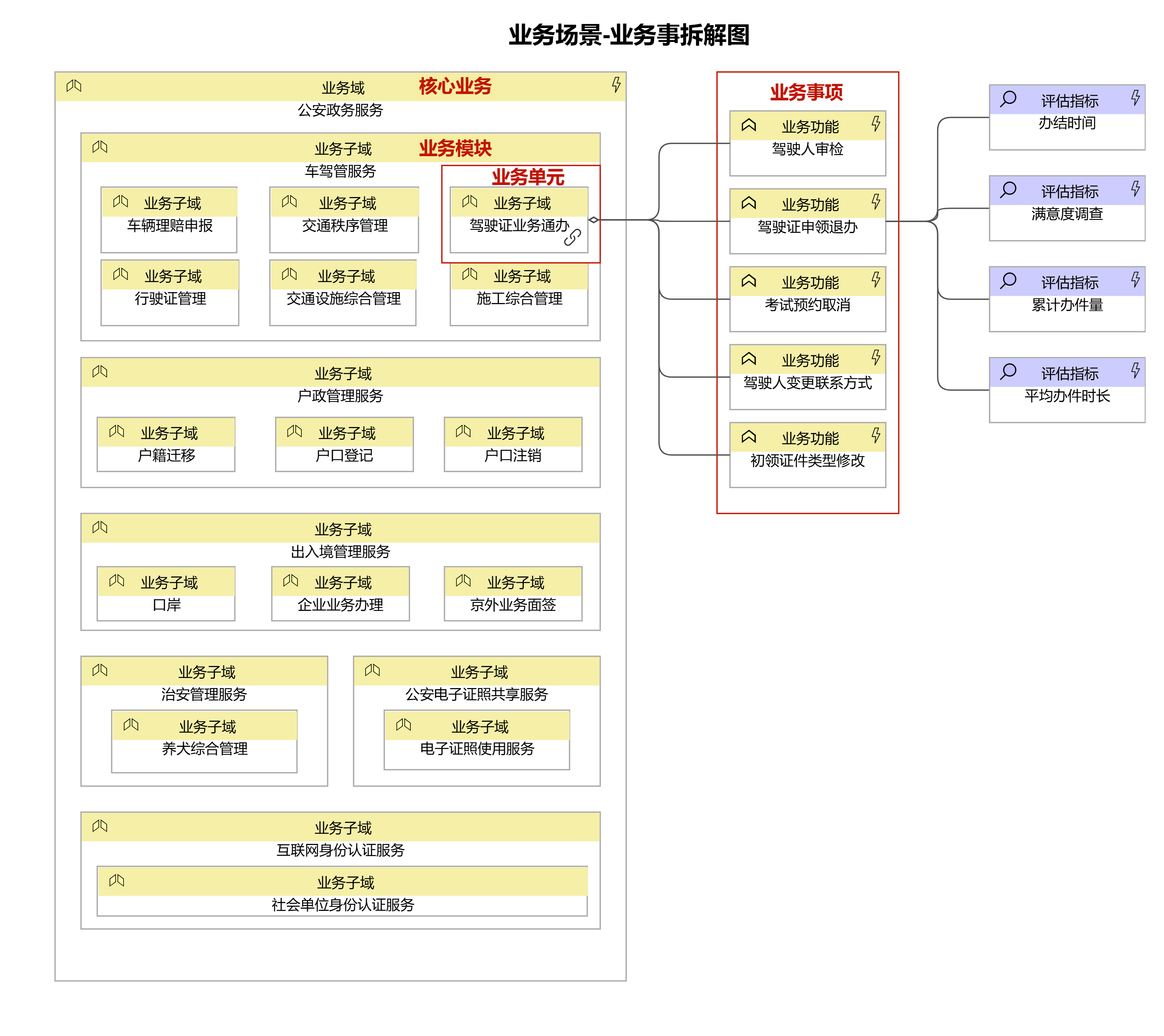 業(yè)務場景與事項拆解:從“大場景”中尋找“小切口”,對核心業(yè)務逐層拆解出業(yè)務場景、業(yè)務單元,直至最小級別的業(yè)務事項。最小級別的業(yè)務事項可以理解為單個部門履職具體化的最小單元,它關聯(lián)了主責部門、使用的數(shù)據(jù)等要素。對多個業(yè)務事項編排,形成解決特定業(yè)務需求的流程。因此,謀劃多跨協(xié)同場景需要將業(yè)務拆解到最小級別的業(yè)務事項才能滿足要求。
