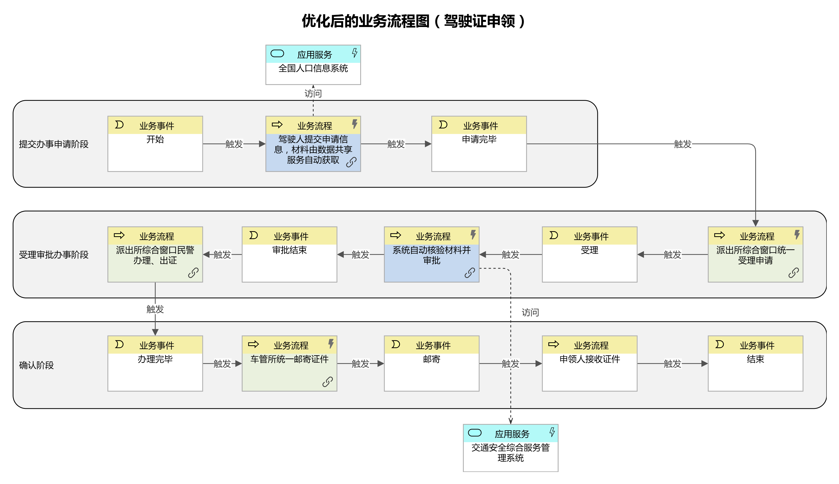 優(yōu)化業(yè)務流程:謀劃好可集成的數(shù)據(jù)、可協(xié)同的部門后即完成了多跨場景的集成過程。集成后形成的新流程活動替換現(xiàn)行活動,實現(xiàn)流程的再造。再造流程將解決重大需求中描述的“堵點”、“卡點”問題,因此新流程中的創(chuàng)新活動、智能活動就是需要改革的項目。