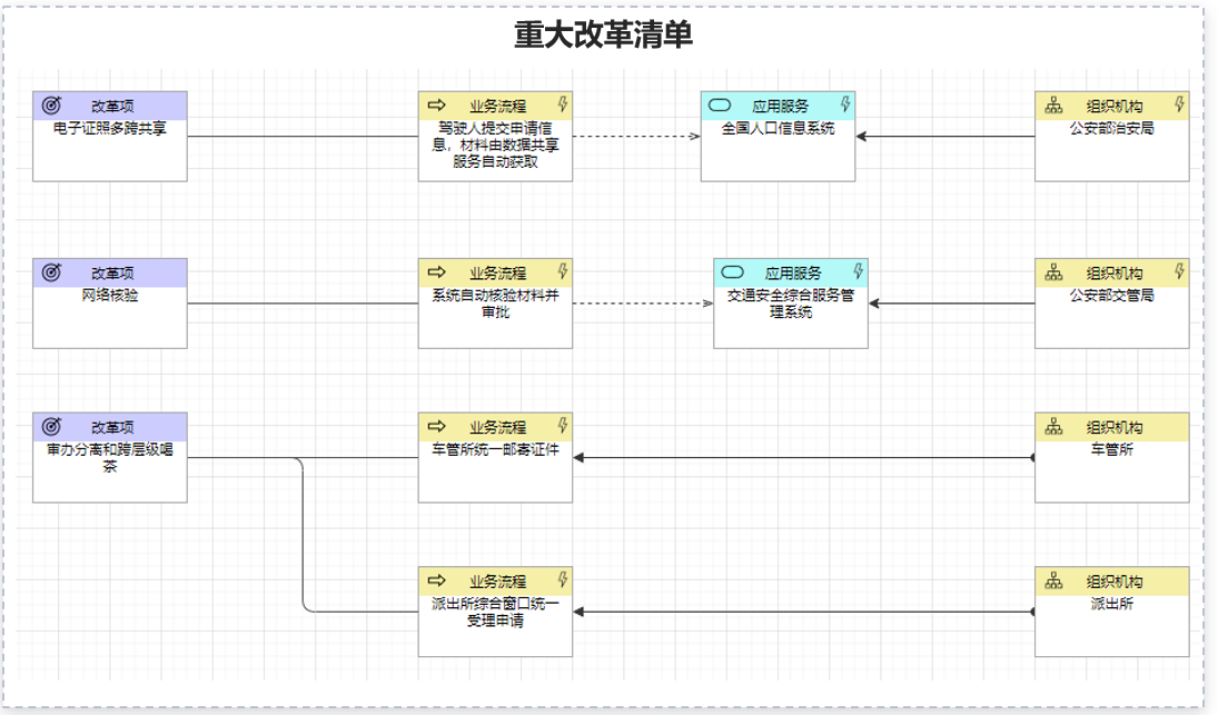 將再造流程中的創(chuàng)新點關聯(lián)到涉及的應用系統(tǒng)以及主管部門,即可形成完整的改革項,最終作為梳理重大改革清單的素材。
