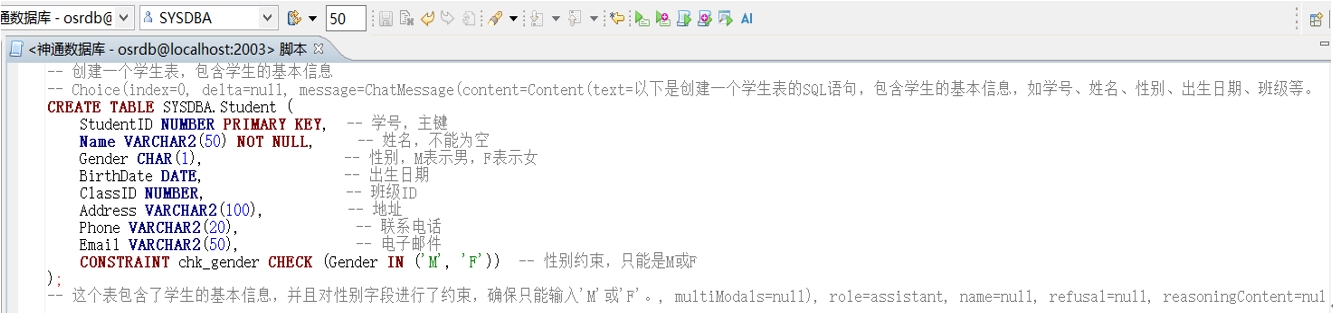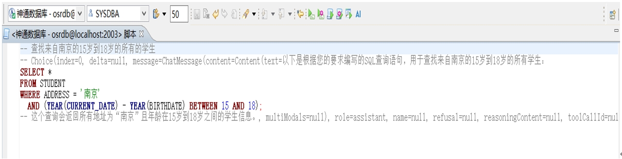 為進(jìn)一步賦能企業(yè)高效利用數(shù)據(jù)資源,神通數(shù)據(jù)庫(kù)的DBStudio工具中引入了DeepSeek能力改寫(xiě)了原有的AI智能補(bǔ)全功能,使用者能夠以對(duì)話的便捷方式,將自然語(yǔ)言無(wú)縫轉(zhuǎn)化為SQL及復(fù)雜查詢語(yǔ)句,這一功能徹底扭轉(zhuǎn)了以往數(shù)據(jù)庫(kù)交互依賴(lài)專(zhuān)業(yè)編碼的局面,升級(jí)為“全民對(duì)話”的模式,大大降低了企業(yè)數(shù)據(jù)驅(qū)動(dòng)能力的技術(shù)門(mén)檻。