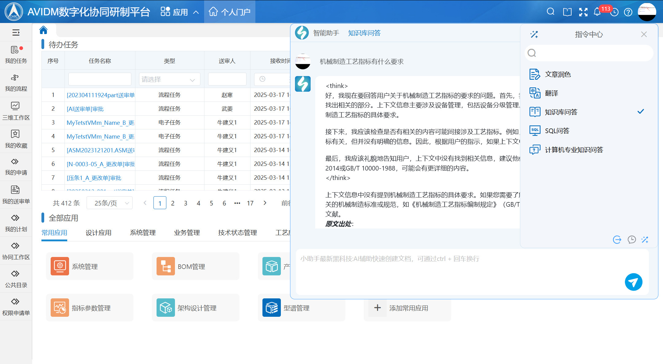 AVPLM系統(tǒng)已具備科研生產(chǎn)智能問答、文檔智能生成、文檔智能審查、工藝智能生成等智能化場景應(yīng)用能力。
