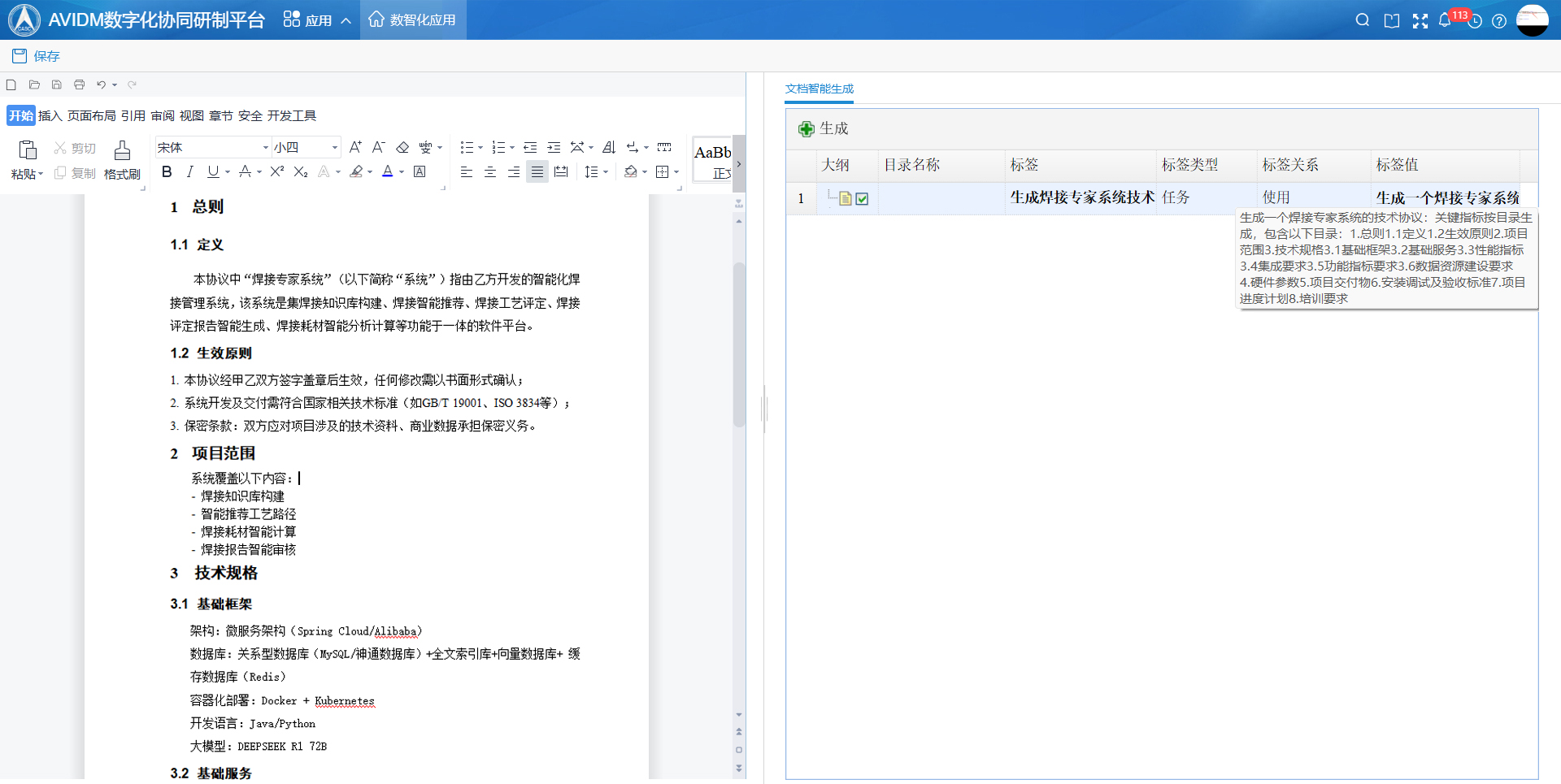 通過解析文檔模板與設(shè)計要求中的關(guān)鍵指標和關(guān)鍵詞,調(diào)用DeepSeek大模型進行語義分析,可結(jié)合科研生產(chǎn)的項目管理、體系論證、系統(tǒng)設(shè)計、工藝設(shè)計、生產(chǎn)制造、試驗驗證和運維保障業(yè)務(wù)要求,基于歷史文檔庫的相似案例匹配,一鍵生成符合規(guī)范的技術(shù)文檔。