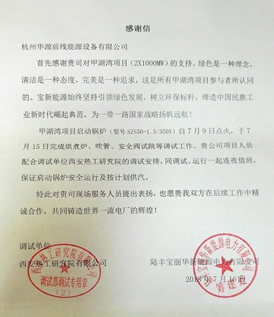 調(diào)試單位同時發(fā)來表揚信,稱贊我們配合度高,按計劃保障了主鍋爐供汽需求,嗯,這份肯定,我們收下了。
