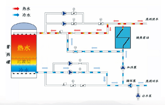 3000立方米可供近30萬平方米供熱。內部采用華源專利布水技術,盡可能地利用蓄水溫差并抑制冷熱水混合,獲得最佳蓄能體積效率;系統設計精細,供回水自然分層;利用大溫差變頻小流量保證充分節能蓄熱放熱;利用布水器的設置控制蓄水槽的內部流動,保證冷熱水交匯層厚度最小。
