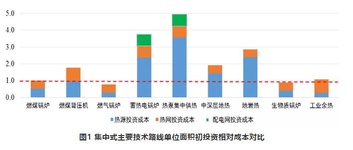 初投資成本方面,集中供暖方式中,燃?xì)忮仩t單位面積初投資低于燃煤鍋爐,生物質(zhì)鍋爐、工業(yè)余熱單位面積初投資與燃煤鍋爐相當(dāng),燃煤背壓機(jī)與中深層地?zé)釂挝幻娣e初投資是燃煤鍋爐的1.5~2.0倍,集中式電供暖投資成本最高,是燃煤鍋爐的3.5~5倍,主要是供熱系統(tǒng)造價(jià)比較貴,配電網(wǎng)改造成本在總成本中占比約為15%~20%;地巖熱單位面積投資成本高于中深層地?zé)幔侨济哄仩t的2.5~3.0倍。