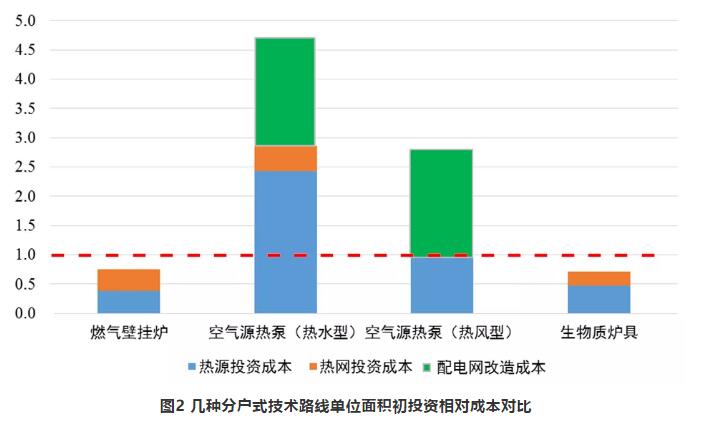 分散供暖方式中,分戶式生物質(zhì)供暖運(yùn)行成本最低,僅是燃煤鍋爐的0.7倍,熱泵供暖與燃煤鍋爐相當(dāng),壁掛爐供暖運(yùn)行成本是燃煤鍋爐的1.5~2.0倍。